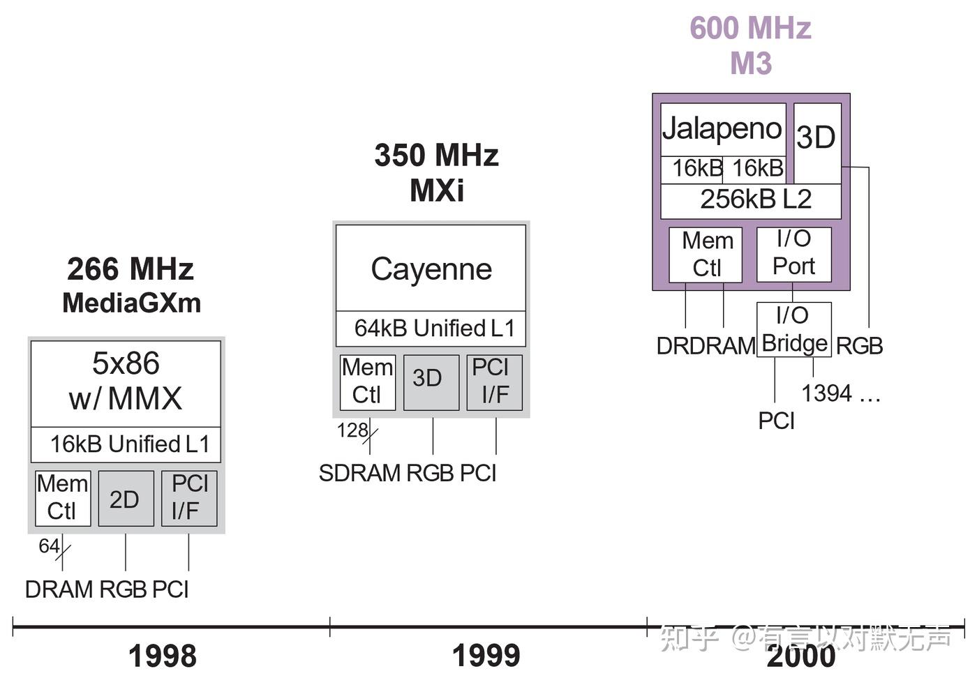 Cyrix 开发的 Cayenne 微架构是 6x86MX/MII 处理器的演进版,具有双路 FPU、支持 3DNow 指令和64KB L1 和 256 KB、8-way L2 缓存。它使用在VIA Cyrix III /Joshua(后来更名为 C3)中,具有2200 万个晶体管。