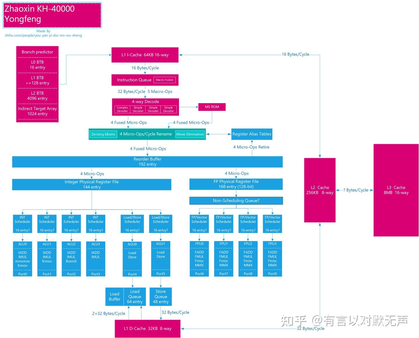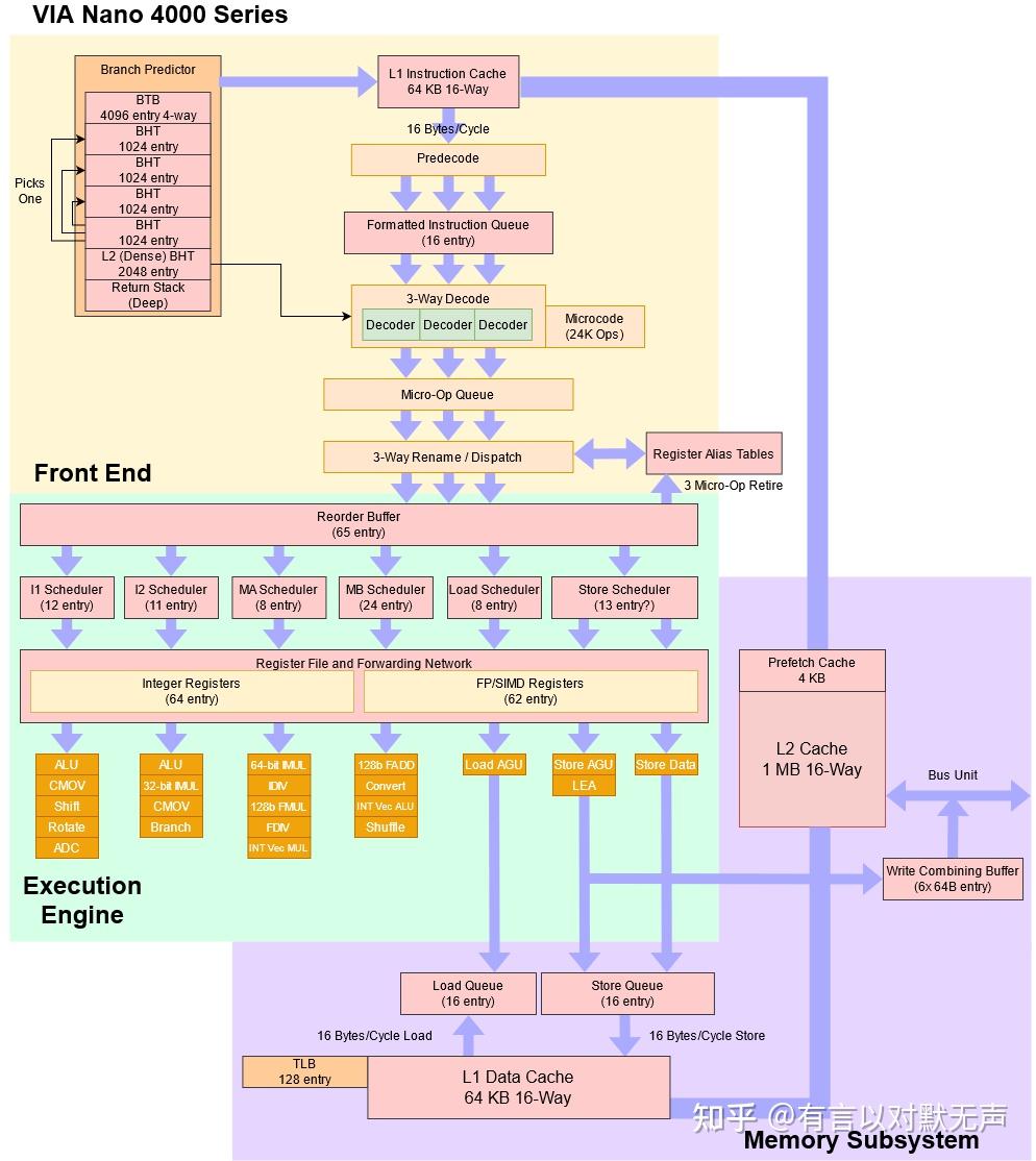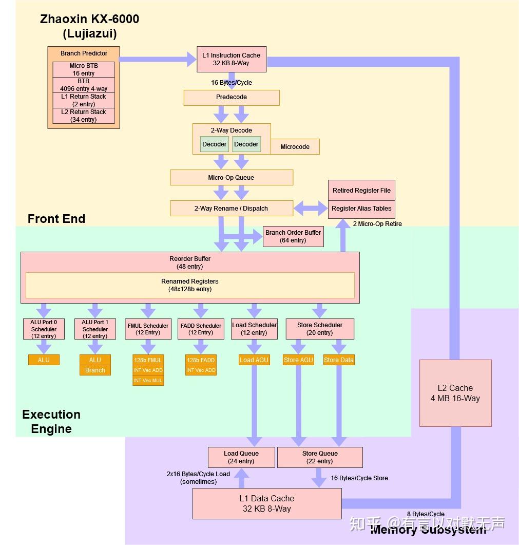- CISC解码:永丰的解码器类似Intel设计,具有3个简单解码器和1个复杂解码器。