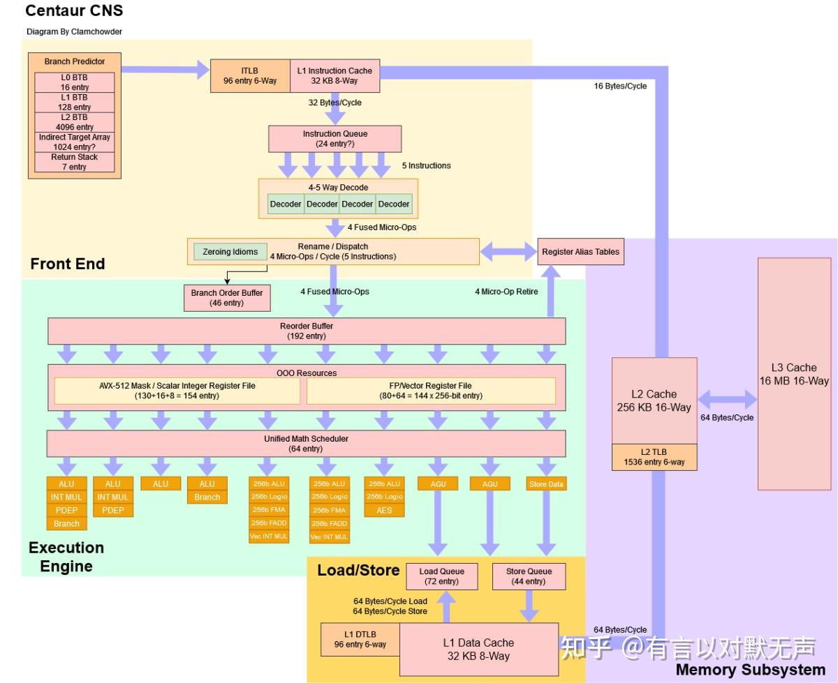 - CNS有3个FP/AVX单元,两个包括浮点乘累加(MAC)单元;第三个FP/AVX单元处理FP除法和加密(AES)加速。所有这三个单元都可以处理AVX整数指令。